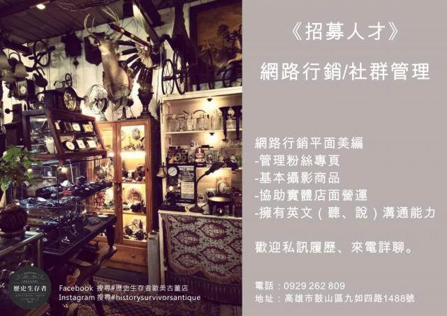 擅長工具:Adobe Photoshop自備車輛:機車其他條件:基本設計、商品拍攝,需幫忙網路行銷、經營粉絲專頁、門市人員。