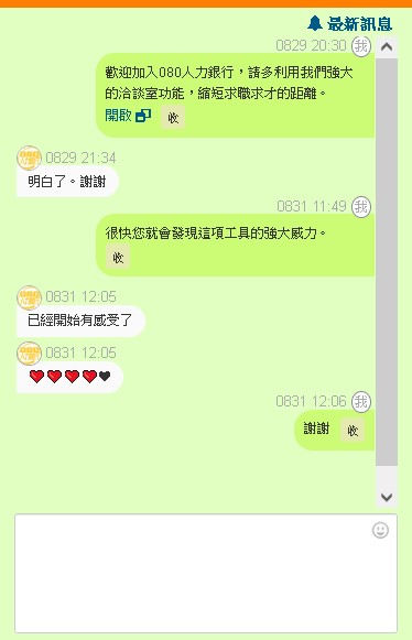 080人力銀行即時洽談室採用Messenger概念進行設計,讓求才求職雙方可以一對一即時互動,一方不在線上的時候,也可以留言。
